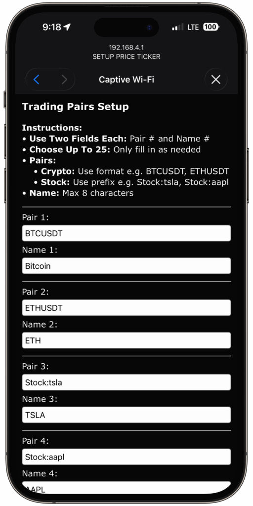 Each asset on your device has two fields: Name and a Pair. The Name is the label shown on your display (like “Bitcoin” or “Apple”), while the Pair is the exact market code used by the live data source (like BTCUSDT or Stock:aapl). Your device can track up to 25 assets at once, mixing both stocks and crypto pairs in any combination.
